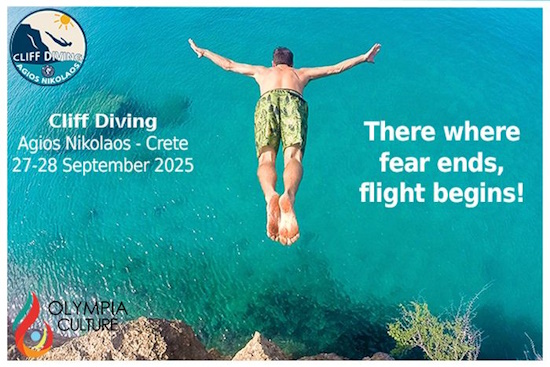 • Το ίδιο Σαββατοκύριακο 27 και 28 Σεπτεμβρίου θα διεξαχθεί στη λίμνη Βουλισμένη του Αγίου Νικολάου στην Κρήτη το «Cliff Diving Agios Nikolaos». Κορυφαίοι αθλητές από όλο τον κόσμο θα εκτελέσουν θεαματικά άλματα στο νερό από μεγάλο ύψος, χωρίς τη χρήση ειδικού εξοπλισμού, μετατρέποντας το λιμάνι σε σκηνικό μοναδικής έντασης και ομορφιάς. Πρόκειται για μια εμπειρία που συνδυάζει τον αθλητισμό, τον πολιτισμό και τον τουρισμό, φέρνοντας κοντά επισκέπτες, κατοίκους και φίλους της περιπέτειας. Το «Cliff Diving Agios Nikolaos» ξεκινά την Παγκόσμια Ημέρα Τουρισμού, γι’ αυτό στο παράλληλο πρόγραμμά του εντάσσονται πολιτιστικές εκδηλώσεις, όπως παραδοσιακοί χοροί, φεστιβάλ γαστρονομίας, dj party κ.ά.