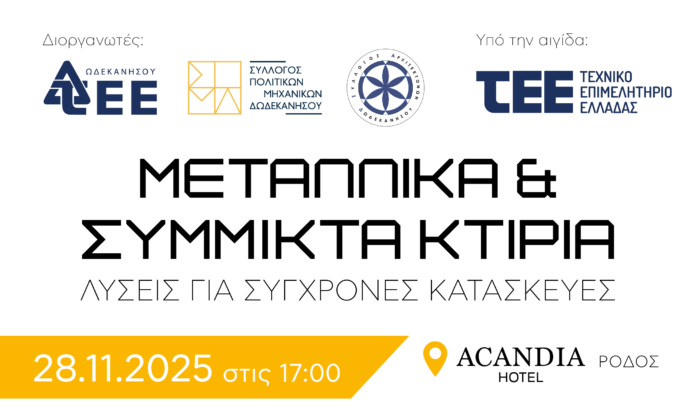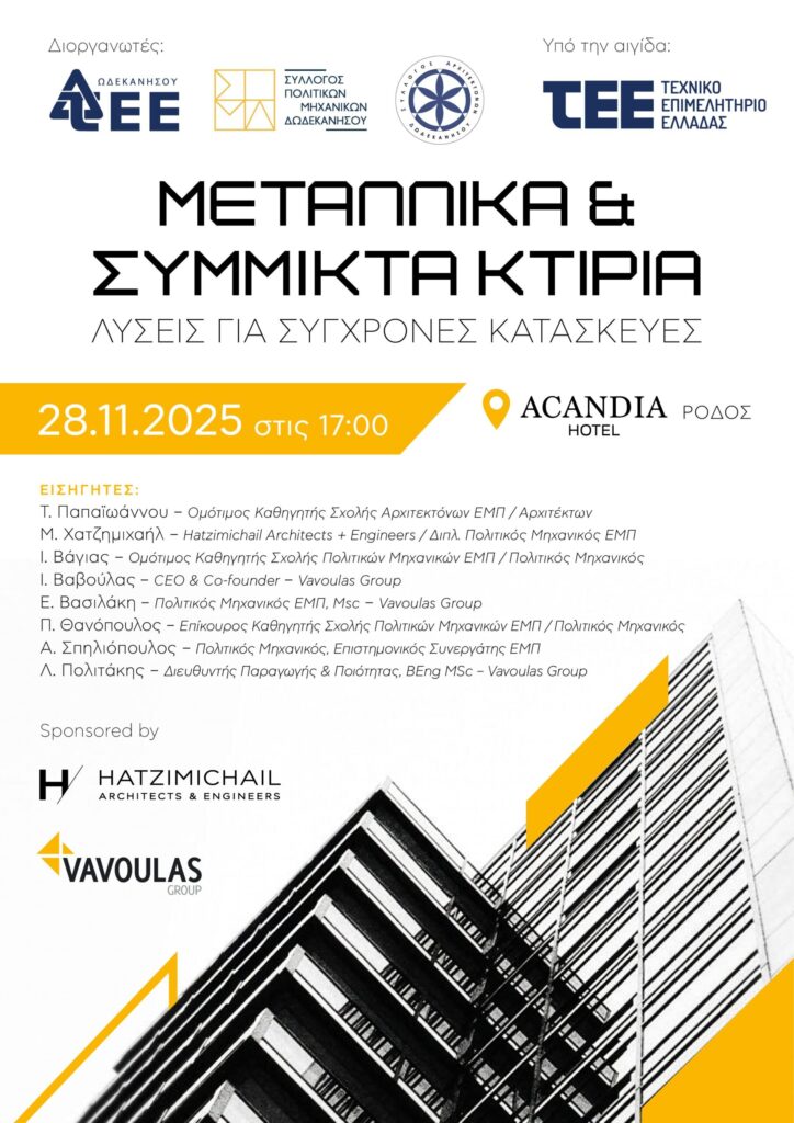 Στο πλαίσιο της εσπερίδας που διοργανώνει το ΤΕΕ Δωδεκανήσου σε συνεργασία με τον Σύλλογο Πολιτικών Μηχανικών Δωδεκανήσου & τον Σύλλογο Αρχιτεκτόνων Δωδεκανήσου η οποία τελεί υπό την αιγίδα του Τεχνικού Επιμελητηρίου Ελλάδας (ΤΕΕ) οι εταιρείες Vavoulas Group [turn key construction] και Hatzimichail Architects + Engineers θα συμμετάσχουν με εξειδικευμένες εισηγήσεις και εταιρικές παρουσιάσεις, εστιάζοντας στην τεχνογνωσία και την καινοτομία στον τομέα των μεταλλικών και σύμμικτων κατασκευών.