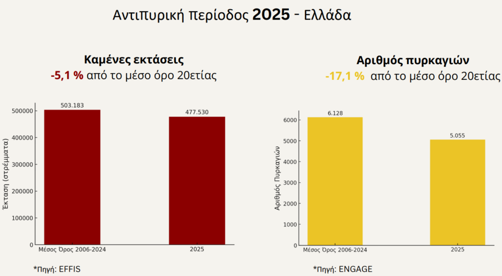 Σύμφωνα με τα στοιχεία που παρουσιάστηκαν, οι συνολικές καμένες εκτάσεις στη χώρα το 2025 εκτιμώνται σε περίπου 477.000 στρέμματα, έναντι ιστορικού μέσου όρου 503.000 στρεμμάτων για την περίοδο 2006–2024, δηλαδή μείωση περίπου 5%.