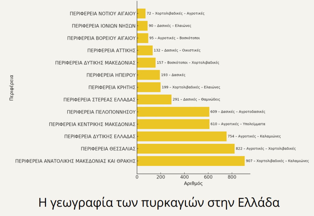 Η εποχική κατανομή κορυφώνεται στους μήνες Ιούνιο–Αύγουστο, όταν συνυπάρχουν υψηλές θερμοκρασίες, χαμηλή υγρασία και αυξημένη αγροτική δραστηριότητα. Οι περιοχές με υψηλή συχνότητα ταυτίζονται με αγροτικές και καλλιεργήσιμες εκτάσεις, όπου παρατηρούνται δραστηριότητες θερισμού, καθαρισμού αγρών και καύσης υπολειμμάτων καλλιεργειών.