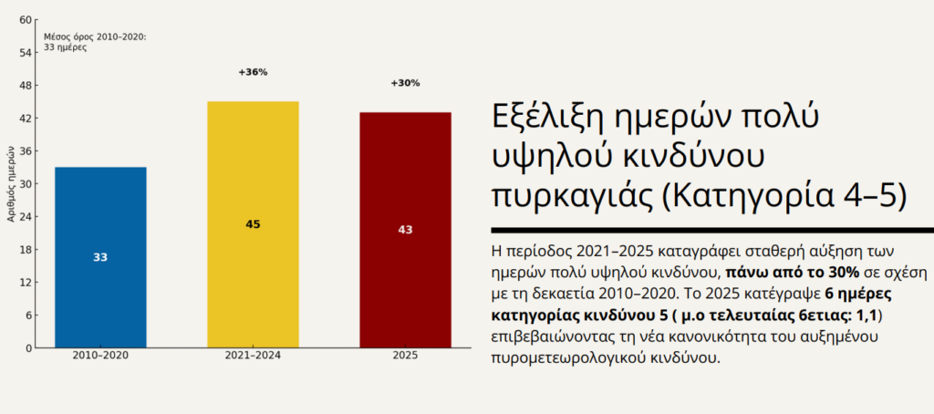Όπως έγινε σαφές, η πίεση λόγω των επιπτώσεων της κλιματικής κρίσης είναι εμφανής αφού το 2025 κατεγράφησαν έξι ημέρες με Δείκτη Επικινδυνότητας 5, έναντι του μέσου όρου της 1,1 στην περίοδο 2006–2024. Παρά ταύτα, το εθνικό σύστημα διαχείρισης παρέμεινε αποτελεσματικό. Ενδεικτικά, το 112 ενεργοποιήθηκε μόλις στο 5,5% των περιστατικών, επιβεβαιώνοντας στοχευμένη χρήση του συστήματος αποκλειστικά όπου προέκυπτε πραγματικός κίνδυνος για πολίτες ή οικισμούς.