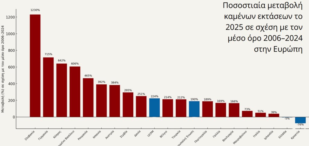 Σύμφωνα με τα στοιχεία το 2025 έγινε σαφές ότι η κλιματική κρίση δεν περιορίζεται πλέον στη Μεσόγειο. Πυρκαγιές μεγάλης έντασης έχουν εκδηλωθεί και σε κράτη της Κεντρικής και Βόρειας Ευρώπης, όπου το φαινόμενο ήταν ιστορικά σπάνιο. Στη Γερμανία οι καμένες εκτάσεις αυξήθηκαν κατά περίπου 700% σε σχέση με τον μέσο όρο της προηγούμενης εικοσαετίας, στην Αυστρία κατά 380 %, στη Δανία κατά 250 %, στη Σλοβακία πάνω από 1.200 %, ενώ στη Φινλανδία η αύξηση προσέγγισε το 120%.