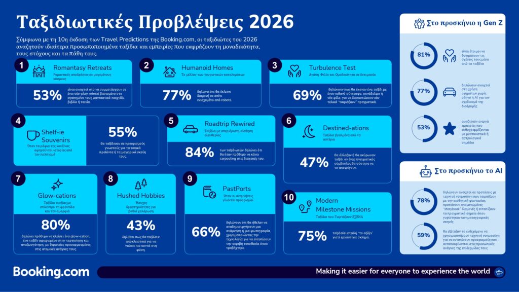 Σύμφωνα με τη 10η έκδοση των Travel Predictions της Booking.com, οι ταξιδιώτες του 2026 αναζητούν ιδιαίτερα προσωποποιημένα ταξίδια και εμπειρίες που εκφράζουν τη μοναδικότητα, τους στόχους και τα πάθη τους