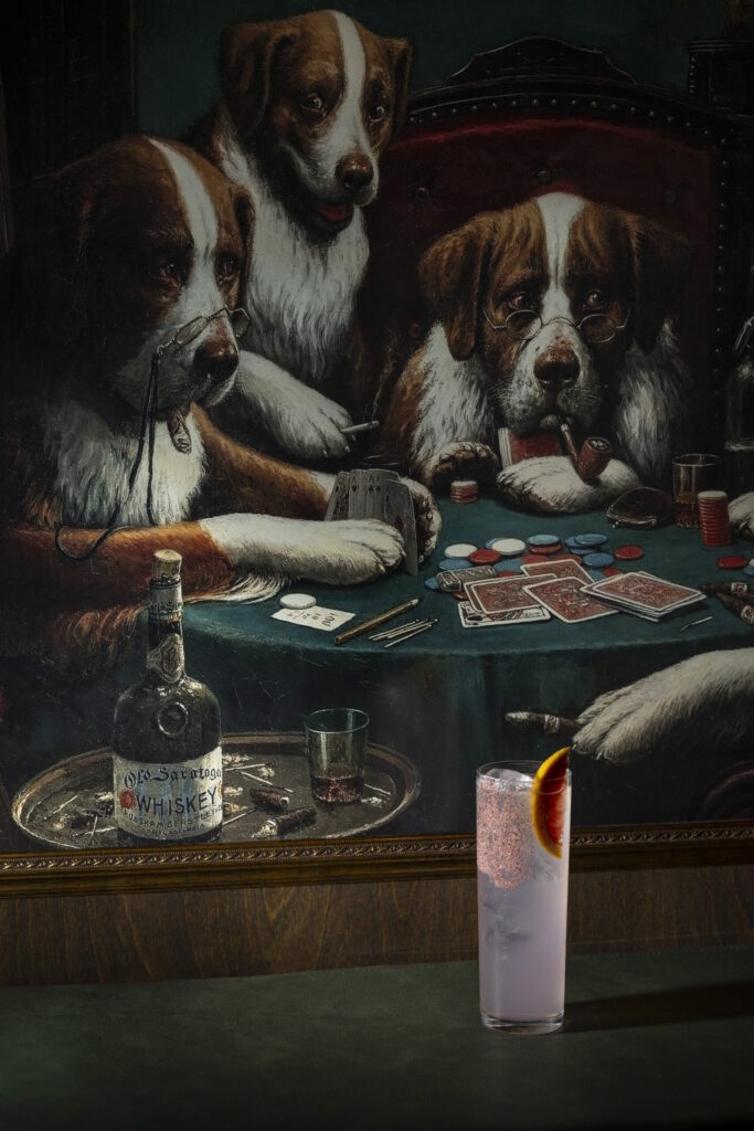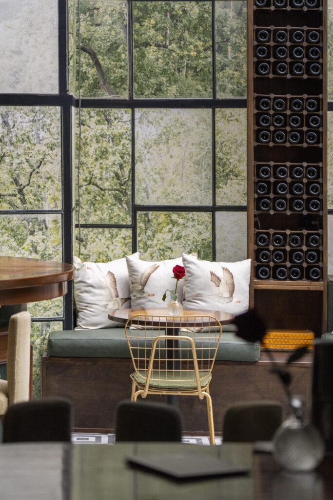 Η ατμόσφαιρα θυμίζει urban living room: μπάρα που αγκαλιάζει το χώρο, πράσινοι δερμάτινοι καναπέδες, χρυσές καρέκλες, μωσαϊκό, industrial λεπτομέρειες, γυάλινο ταβάνι και τοίχος-παράθυρο που αφήνουν την Αθήνα να μπαίνει μέσα σαν φως και σκιά. Το τζάκι, οι βιβλιοθήκες, το τραπέζι-σκακιέρα και οι καδραρισμένες γάτες με witty quotes προσθέτουν την «σπιτική» νότα σε ένα σκηνικό που μοιάζει κάπως ανάμεσα σε old London club και αθηναϊκό loft.