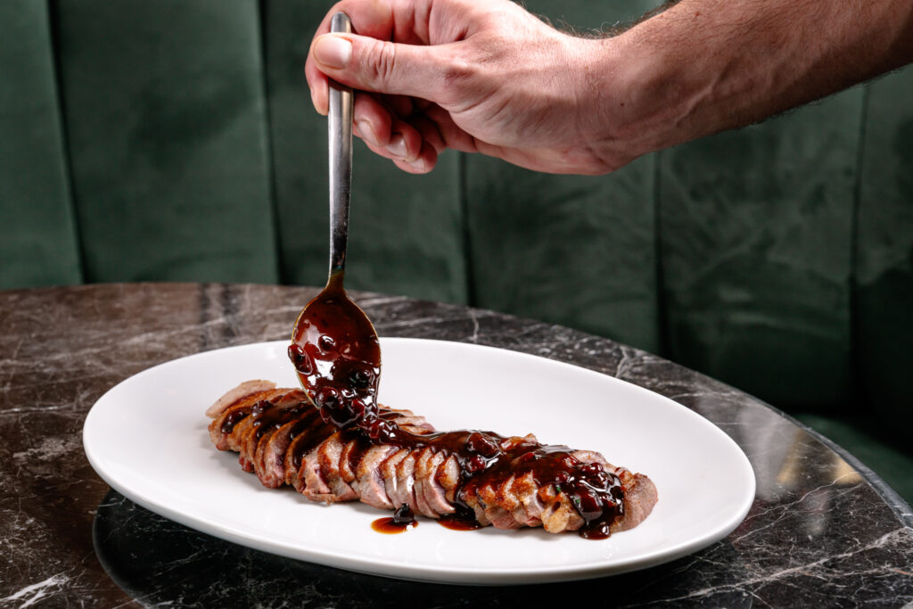 Το στήθος πάπιας διατηρεί τον ροζ πυρήνα του και συνοδεύεται από compote κόκκινων φρούτων ενώ στο ψάρι, η φρέσκια γλώσσα meunière είναι μια κλασική επιλογή που μας θυμίζει την αξία του βουτύρου στη γαλλική κουζίνα.