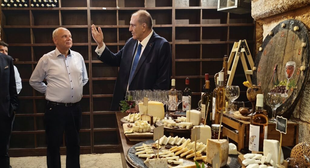 Ο Δημήτρης Καλαϊτζιδάκης, Operations Director του ομίλου Grecotel, παρουσιάζει στον Sebastian Ebel και άλλα στελέχη της TUI τα προϊόντα τοπικών παραγωγών της Agrecofarm