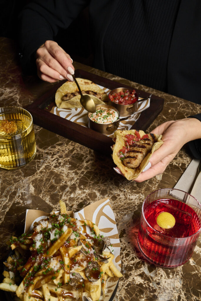 Το street-food & bar menu είναι ευφυές και νόστιμο. Τα seafood «popsicles»: κροκέτες καβουριού και γαρίδας σε ξυλάκι με μαγιονέζα yuzu, είναι μια παιχνιδιάρικη ιδέα με upscale αποτέλεσμα. Ο «γύρος» από ibérico με ντοματίνια, πίκλα κρεμμυδιού και ελληνικό γιαούρτι ενώνει Ανατολή-Δύση με καθαρή γεύση, ενώ στα ζυμαρικά, η συνεργασία με τον τριάστερο Antonino Cannavacciuolo ανεβάζει τον πήχη: ταλιατέλες με αυγοτάραχο Τρικαλινού και ξύσμα λεμονιού, και Cacio e Pepe με χειροποίητα μακαρόνια και κρέμα umami έχουν γίνει signature.