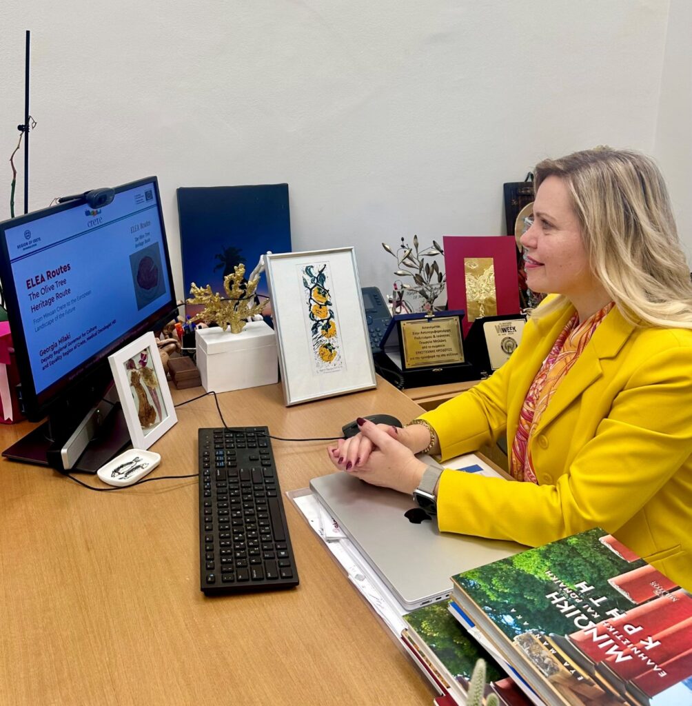 Στο πλαίσιο των εργασιών η Αντιπεριφερειάρχης Πολιτισμού Κρήτης, Γεωργία Μη-λάκη, παρουσίασε με διαδικτυακή συμμετοχή την πρόταση-ορόσημο της Κρήτης για τη δημιουργία της Πολιτιστικής Διαδρομής “Elea Heritage Route”, αφού προη-γουμένως η Προϊσταμένη του Τμήματος Διεθνών Σχέσεων του Υπουργείου Πολι-τισμού Μαριάνθη Αναστασιάδου, ενημέρωσε τους εκπροσώπους των κρατών με-λών του Συμβουλίου της Ευρώπης για την πρωτοβουλία της νέας πολιτιστικής διαδρομής.