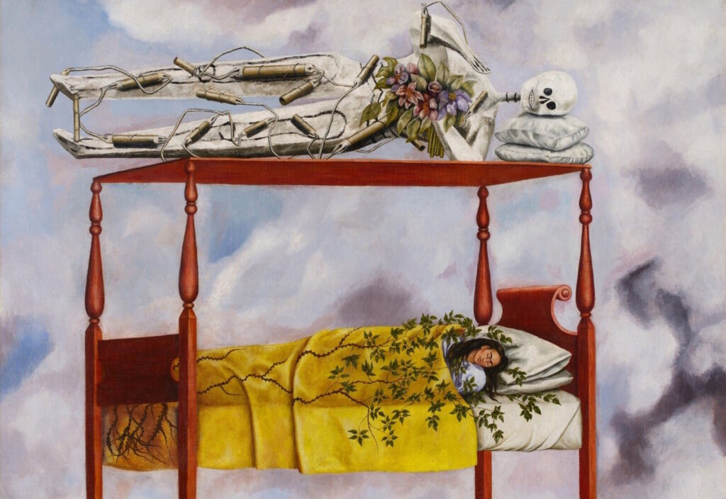 Ο πίνακας, ένα σουρεαλιστικό πορτρέτο, δείχνει τη Φρίντα να κοιμάται σε ένα ξύλινο κρεβάτι που μοιάζει να αιωρείται στον ουρανό. Από πάνω ένας σκελετός από παπιέ μασέ τυλιγμένος με δυναμίτη και κρατά μια ανθοδέσμη, έχοντας ένα ανεπαίσθητο, σχεδόν ανατριχιαστικό χαμόγελο. Ενας πίνακας, που κατά τους ειδικούς του Sotheby’s, είναι από τις πιο προσωπικές και συμβολικές του έργου της.