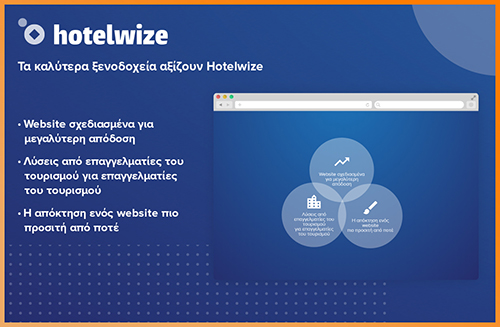 Μέσα από ένα συνδυασμό χαρακτηριστικών, όπως η νέα πλατφόρμα με τεχνολογία αιχμής, τα σχέδια υψηλής αισθητικής, η ευέλικτη τιμολογιακή πολιτική καθώς και η αποτελεσματική εξυπηρέτηση πριν, κατά τη διάρκεια αλλά και μετά την ανάπτυξη του website, καθιστούν την Hotelwize μία από τις καλύτερες επιλογές για το νέο website του ξενοδοχείου ή του ενοικιαζόμενου καταλύματός σας.