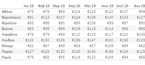 The chart below shows (in Greek) the average hotel prices for nine European capitals (Athens, Barcelona, Berlin, Vienna, Lisbon, London, Moscow, Paris and Rome from top to bottom) as they evolved from January 2018 to August 2018: