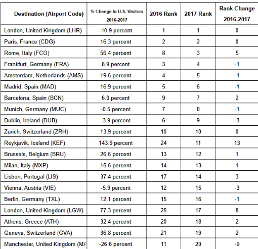 Top destination in Europe is London despite a drop of 10.9%, Paris ranks second recovering after the terrorist attacks by 16.3%, and Rome ranks third with an impressive increase of 56.4%.