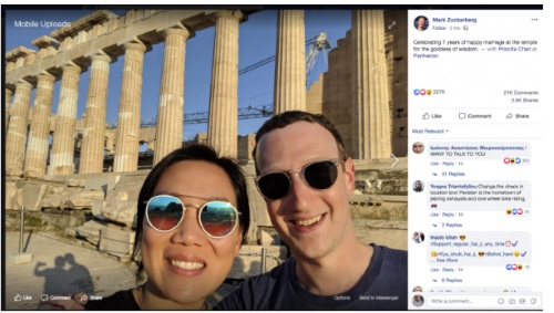 “Celebrating 7 years of happy marriage at the temple for the goddess of wisdom,” the founder of Facebook noted on the popular social media site beneath a selfie with Cham, with the temple’s column’s in the background.