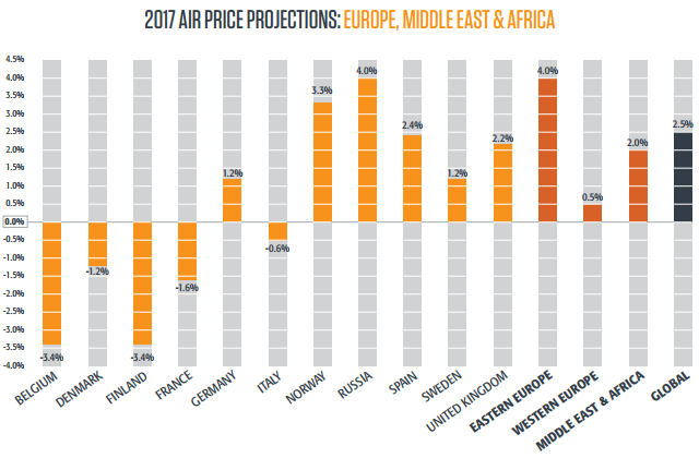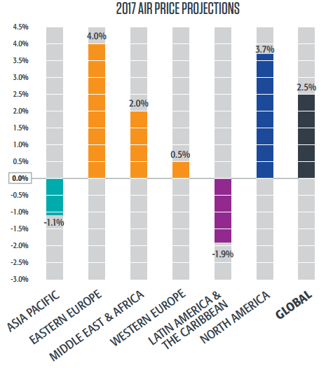 Asia Pacific, while projected to experience a 1.1 percent decrease in prices, is expected to remain mostly stable throughout 2017, helped by lower fuel prices. Japan and Singapore however, are expected to see a significant impact on airfare pricing given currency exchange rate projections.