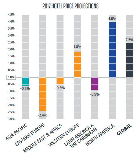 Asia Pacific is expected to see hotel prices fall slightly, by 0.6 percent.