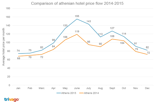 Fluctuations in Athens hotel prices during the year compared to 2014 are shown in following diagram: