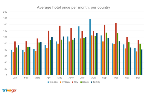 More specifically, Cyprus appears to be the most economical hotel prices during the whole year. Italy has the highest prices throughout the year, except during July and August, where Greek prices are much higher than all of these markets.