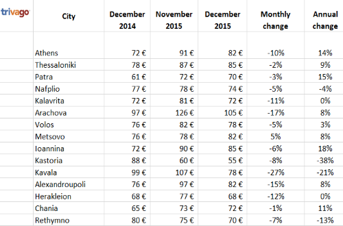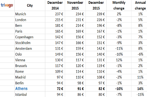 Athens hotel prices increased by 14% in December compared to last year and reached an average of 82 euros, according to trivago.