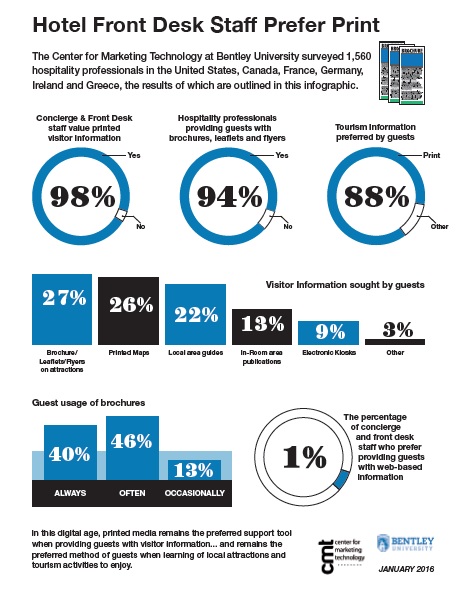 "The survey's data suggests the importance of well-placed printed materials in displays catches the attention of guests and fosters interaction with front desk staff", underlines Ian Cross, CMT Director. Professor Cross declared that he was surprised by the result. "I believed that in 2016 there would be some skepticism regarding the value of printed information material. Yet, as we dug deeper into the research material, it became evident that the reception staff in hotels, consider printed materials easier to use than electronic media. For example, when a customer asks a hotel reception clerk for information or suggestions, it is easier for the employee to show him a printed map and make notes on it."