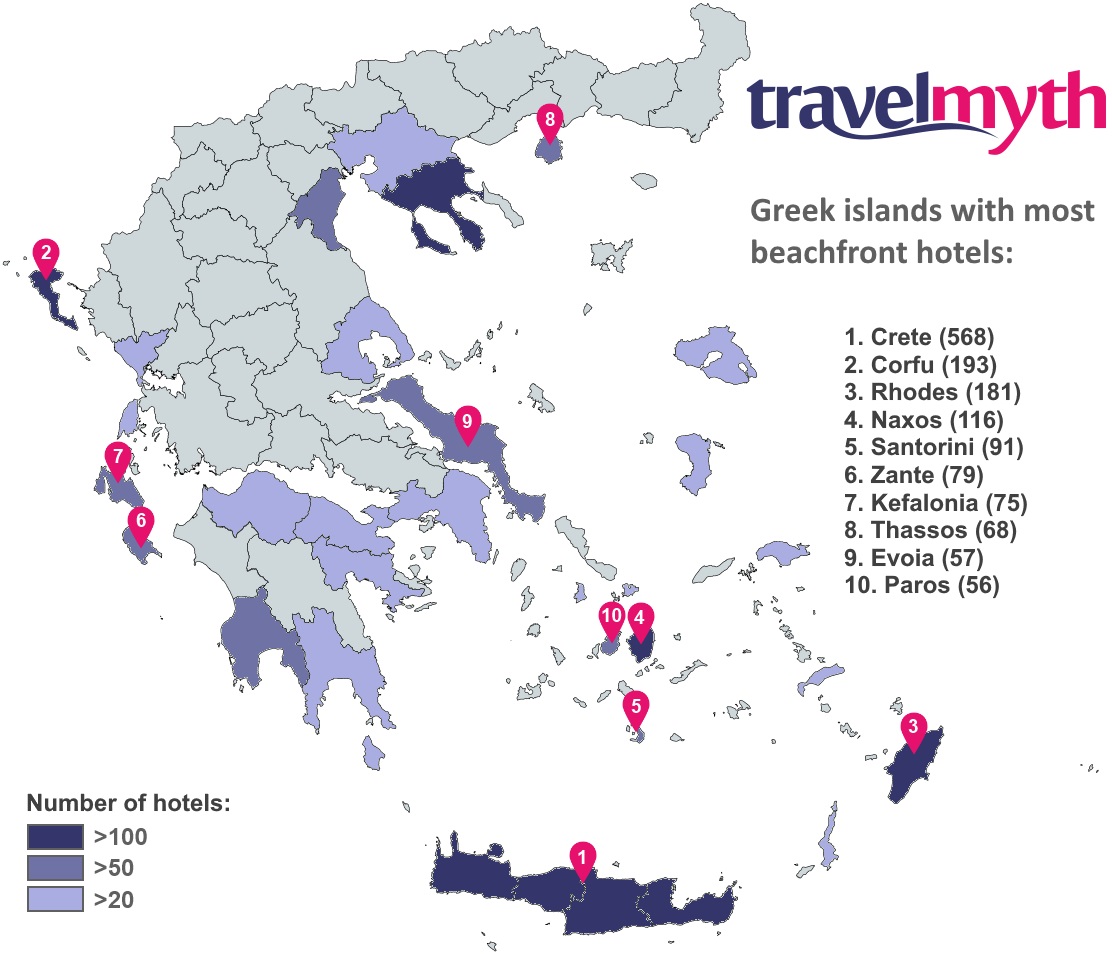 The research of the hotel search engine www.travelmyth.com has nominated Crete as number 1 beachfront hotel destination, with 568 properties being placed just a breath away from the sea. Among these, 203 hotels are located in the prefecture of Chania, 133 in Heraklion, 124 in Rethymnon and 108 in Lassithi.