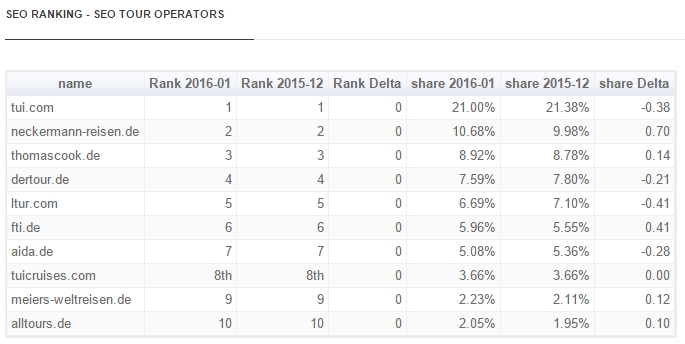 The survey examined the successful online presence and marketing among 250 members of the German Tour Operators Association (DRV), in January 2016. TUI (19,2% share), Aida (11.8% share) and Neckermann-Reisen (8.3% share) retained the top rankings they held during December 2015.