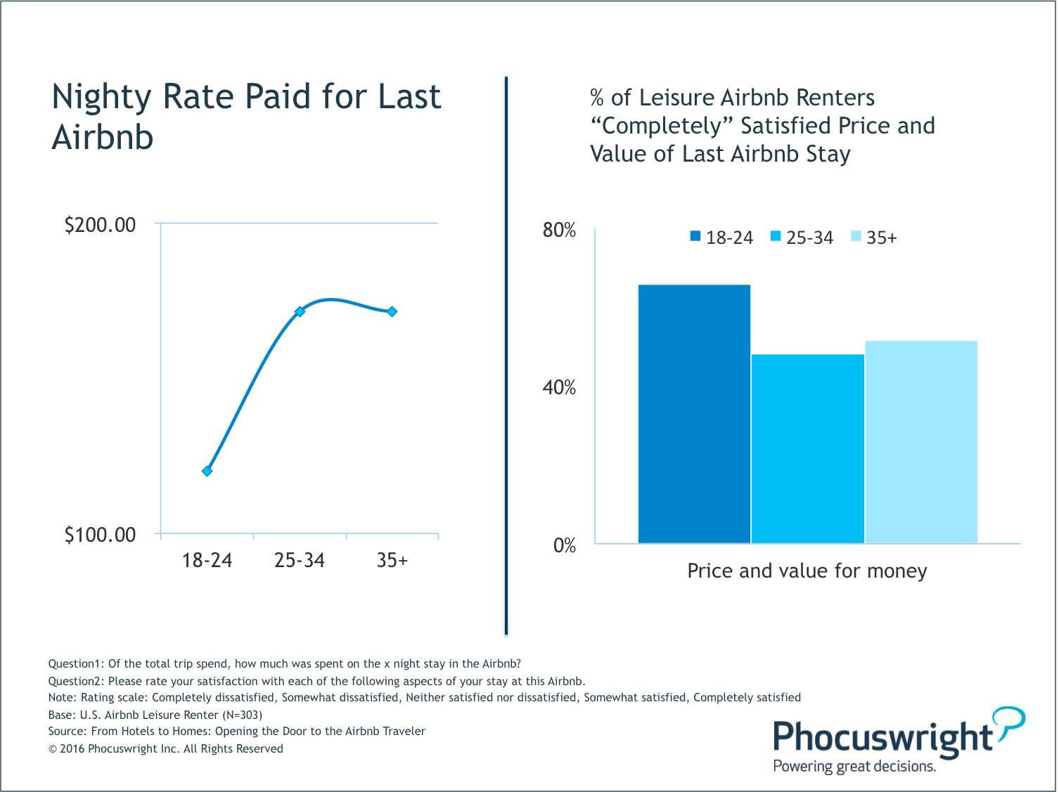 For example, while younger consumers typically have a passion for seeing the world, they often travel on a tight budget. Tastes and preferences, however, generally become a bit more expensive a few years down the road, once travelers get a bit older and settled into their careers. These general patterns in leisure travel spending are becoming increasingly apparent among Airbnb renters. According to Phocuswright'sFrom Hotels to Homes: Opening the Door to the Airbnb Traveler, leisure Airbnb renters between the ages of 18 and 24 paid roughly $100 per night for their last Airbnb (see Figure 1). Nightly rates, however, spike among older age groups, generally closer to $200.