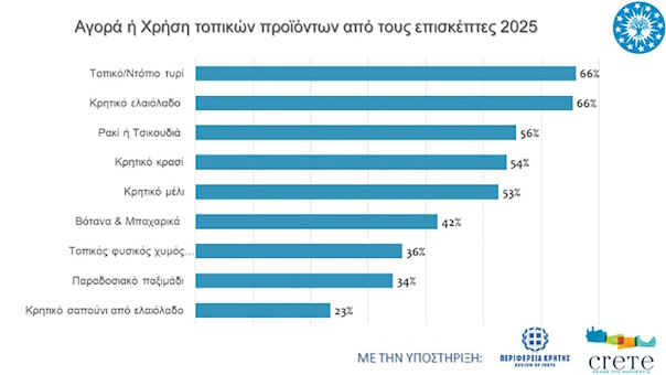 Αναφορικά με τα τοπικά προϊόντα διατροφής, ο αλλοδαπός τουρίστας μένει πολύ ικανοποιημένος από τα ποιοτικά χαρακτηριστικά των προϊόντων αυτών, ενώ φέτος δείχνει να προβαίνει σε μεγαλύτερες από άλλες χρονιές ποσότητες αλλά και ποικιλία προϊόντων. Για πρώτη φορά τα τοπικά τυριά μαζί με το ελαιόλαδο βρίσκονται στις πρώτες θέσεις των προτιμήσεων των αλλοδαπών τουριστών, με δύο στους τρεις αλλοδαπούς επισκέπτες να προβαίνουν σε αγορά αυτών των προϊόντων. Ιδιαίτερη δυναμική παρουσιάζει το κρητικό μέλι, και η τσικουδιά, τα οποία μαζί με το κρασί, προτιμούνται από σχεδόν τους μισούς τουρίστες. Σημαντική επίσης είναι η αύξηση της αγοράς βοτάνων και μπαχαρικών καθώς επίσης και του τοπικού φυσικού χυμού και του παραδοσιακού παξιμαδιού.