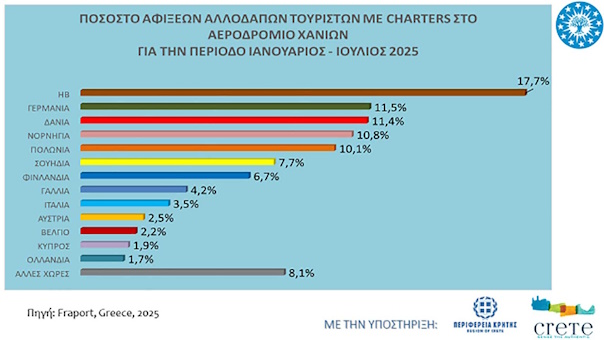 Σχετικά με τις αφίξεις αλλοδαπών τουριστών στο αεροδρόμιο Χανίων και με βάση τα πρόσφατα στοιχεία της Fraport-Greece για την περίοδο Ιανουάριος-Ιούλιος 2025, καταγράφεται ρεκόρ αφίξεων με 875 χιλιάδες αφίξεις, σημειώνοντας αύξηση 3% σε σχέση με την αντίστοιχη περίοδο του 2024, όπου είχαν σημειωθεί 850 χιλ. αφίξεις, χρονιά κατά την οποία είχαν καταγραφεί και οι περισσότερες αφίξεις έως τότε.