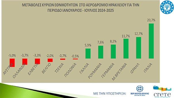 Αναφορικά με τις αφίξεις αλλοδαπών τουριστών στο αεροδρόμιο Ηρακλείου και με βάση τα πρόσφατα στοιχεία της Υπηρεσίας Πολιτικής Αεροπορίας Ηρακλείου, για την περίοδο Ιανουάριος – Ιούλιος 2025, καταγράφεται επίσης ρεκόρ αφίξεων, της τάξεως των 2,1 εκατ. αφίξεων, σημειώνοντας αύξηση κατά 6% σε σχέση με τις αφίξεις της αντίστοιχης περυσινής περιόδου που είχαν φτάσει τα 2 εκ. αφίξεις, οι οποίες ήταν και οι υψηλότερες αφίξεις έως τότε.