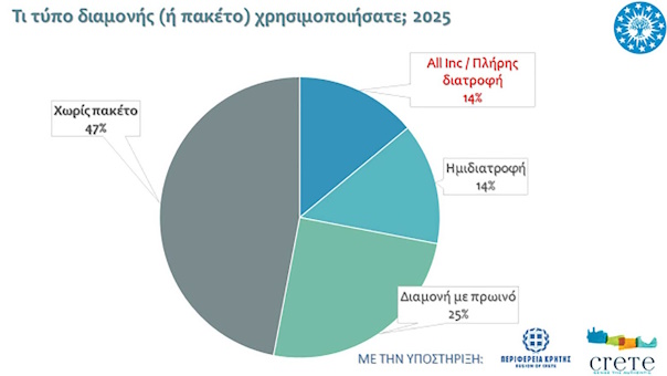 Σταθεροποίηση προτιμήσεων παρατηρούμε στον τύπο καταλύματος αλλά και στα πακέτα διαμονής που προτιμούν οι αλλοδαποί τουρίστες. Πιο συγκεκριμένα, υπάρχει σταθεροποίηση στα ποσοστά των τουριστών που προτιμούν το λεγόμενο πακέτο “all inclusive” γύρω στο 15%, με σχεδόν τους μισούς αλλοδαπούς επισκέπτες να μην προτιμάει κανένα πακέτο. Καθοριστικός παράγοντας για την επιλογή του “all Inclusive” παραμένει η συνοδεία παιδιών κάτω των 15 ετών και η προσέλευση οργανωμένων ομάδων επισκεπτών.
