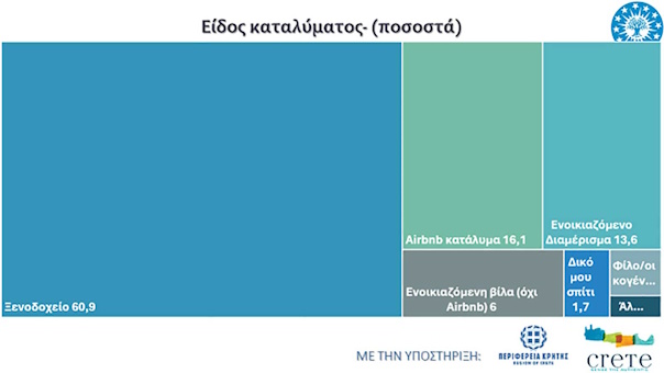 Ελαφρώς αυξημένο είναι το ποσοστό των αλλοδαπών τουριστών που προτιμούν τις βραχυπρόθεσμες ενοικιάσεις τύπου AirBnB, αφού περίπου το 16% των επισκεπτών επιλέγει να διαμένει σε τέτοια καταλύματα. Τα ξενοδοχεία, παραμένουν στην πρώτη θέση των προτιμήσεων των τουριστών, με έξι στους δέκα από αυτούς να τα επιλέγουν, ενώ σχεδόν δύο στους τρεις τουρίστες προτιμούν πολυτελή ξενοδοχεία 4 & 5 αστέρων. Οι βίλες μετά τον διπλασιασμό προσφοράς που παρατηρήθηκε στην περίοδο 2019-21 έχουν φτάσει σταθερά το ποσοστό τους γύρω στο 6%.
