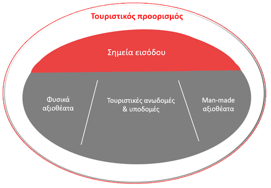 Προτείνεται λοιπόν ένας λειτουργικός ορισμός για τον τουριστικό προορισμό, ο οποίος έχει ως εξής: «Τουριστικός προορισμός είναι μία γεωγραφική περιοχή, με συγκεκριμένα σημεία εισόδου σε αυτή, η οποία έχει αξιοθέατα, φυσικά και man-made και υποστηρίζεται από τουριστικές ανωδομές και υποδομές».