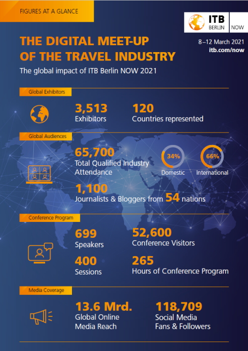 Στο σύνολό τους οι εκθέτες έφτασαν τους 3.513, οι οποίοι εκπροσώπησαν προορισμούς, αλυσίδες ξενοδοχείων και εταιρίες τεχνολογίας από 120 χώρες και χρησιμοποίησαν την ITB Berlin NOW για να παρουσιάσουν τα προϊόντα και τις υπηρεσίες τους, ενώ, έντονο ήταν το ενδιαφέρον των δημοσιογραφικών μέσων καθώς και 1.100 εκπροσώπων μέσων ενημέρωσης και travel bloggers από 54 χώρες, που κάλυψαν ζωντανά τη διοργάνωση.
